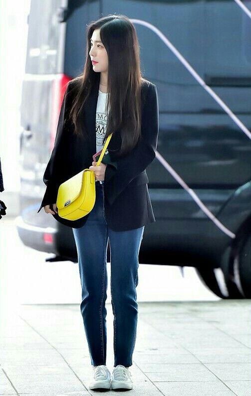 Bagi kalian yang menginginkan look yang lebih formal bisa mencoba look dari Irene red velvet di atas. Dengan blazer hitam dan kaos putih membuat look semi formal, tas warna kuning terang membuat look ini tidak monoton sekaligus memberi kesan fresh.