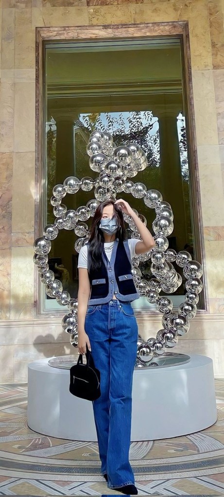 Bagi kalian yang memiliki kaos putih yang menurut kalian boring, bisa nih menambahkan vest denim seperti jennie blackpink, dijamin akan memberi penampilan baru yang lebih catchy.